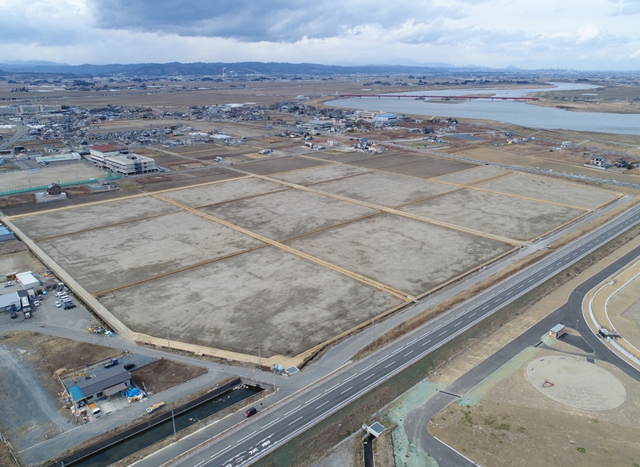 宮城県亘理郡亘理地区における津波浸水被害を受けた農地等の早期復旧と併せ、より生産性の高い農地への再生に向けた、ほ場整備事業です。 整地工・・・A=11.53ha 用水路工・・・L=2513m 排水路工・・・L=2610m [下請]
