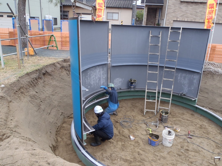 側版、底版、頂版の順で現地組立、溶接、防食作業を行い、潜函工法にて信濃公園内に防火水槽を新設する工事。現地で水槽を組み立てるので、狭い場所、搬入路での施工に適している工法で施工する工事。