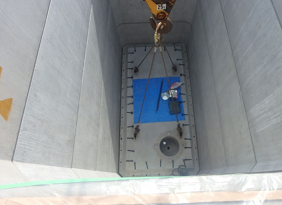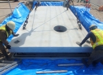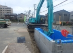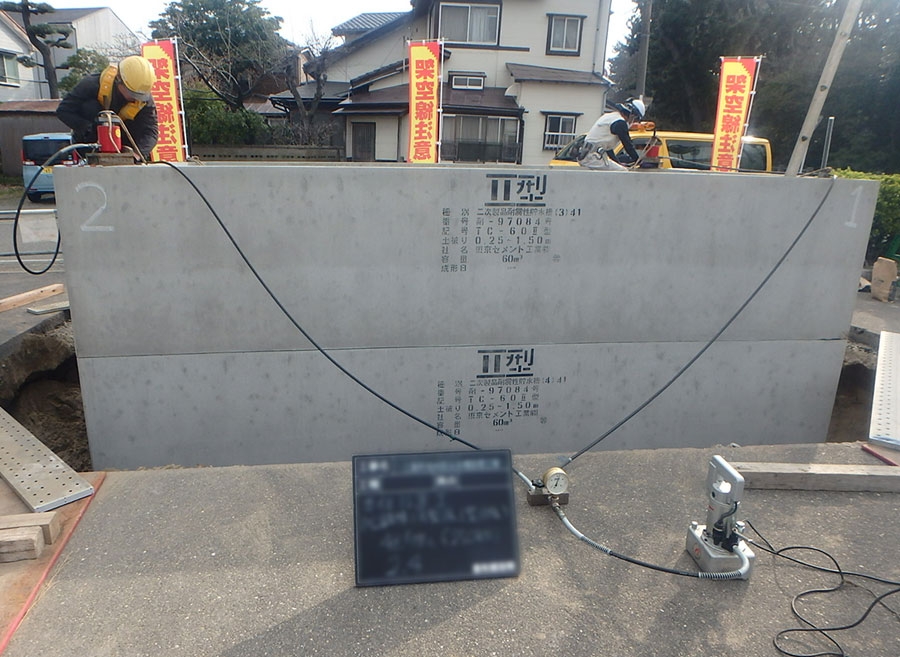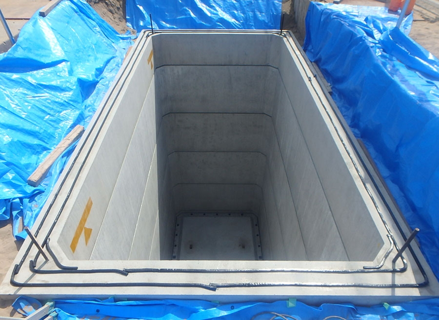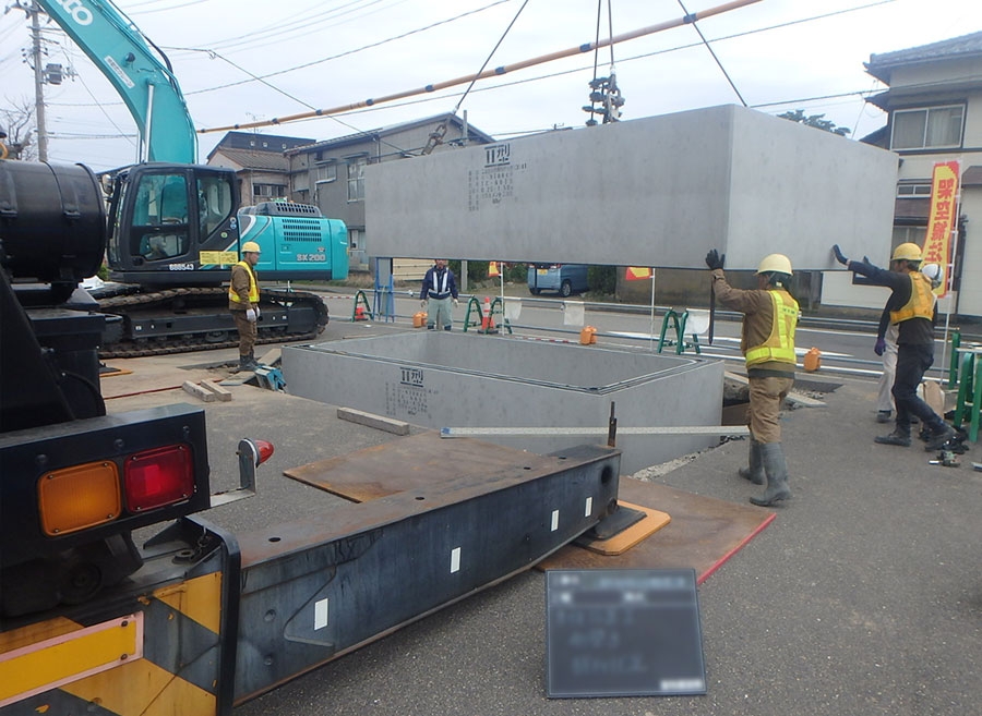 縦置ボックスカルバート型の耐震貯水槽を側壁、底版、頂版の順で現地組立、PC緊張、目地シーリングを行い、潜函掘削工法にてゆいぽーと駐車場内に防火水槽を新設する工事。大型車両が搬入出来る場所に適しており、鋼製縦円筒型より低コスト、短期で施工出来る。 防火水槽設置工:1基 アスファルト舗装工:1式 コンクリート水路工:1式