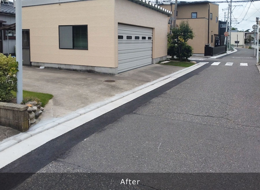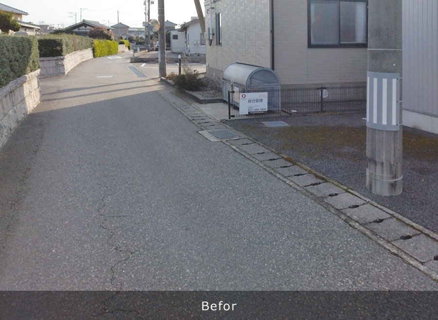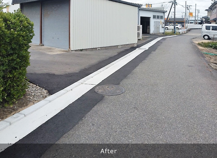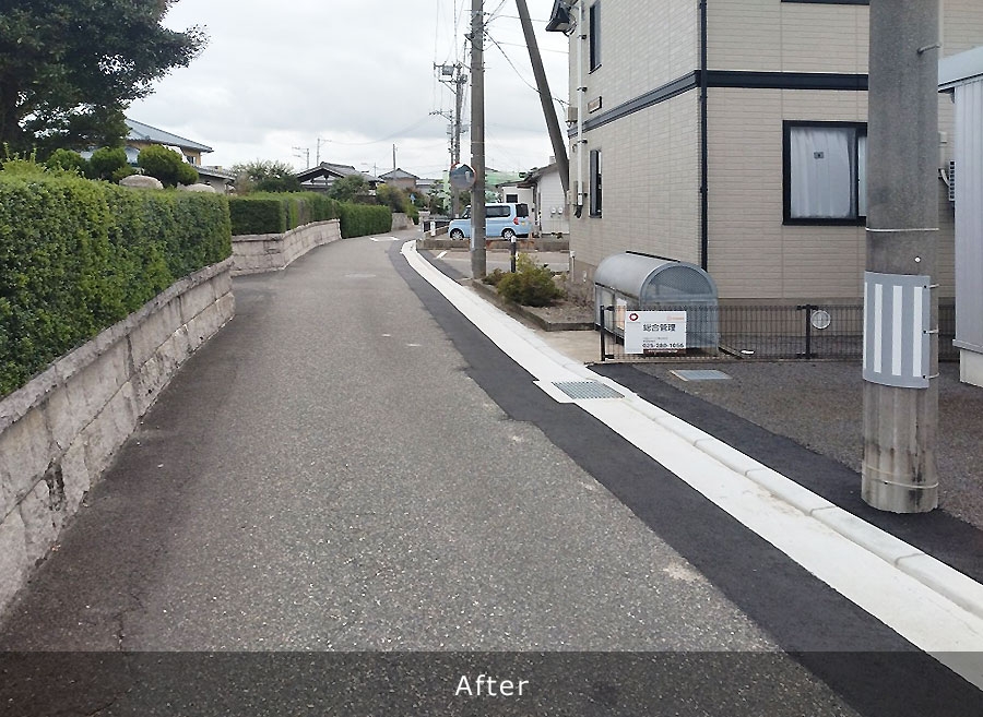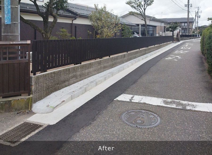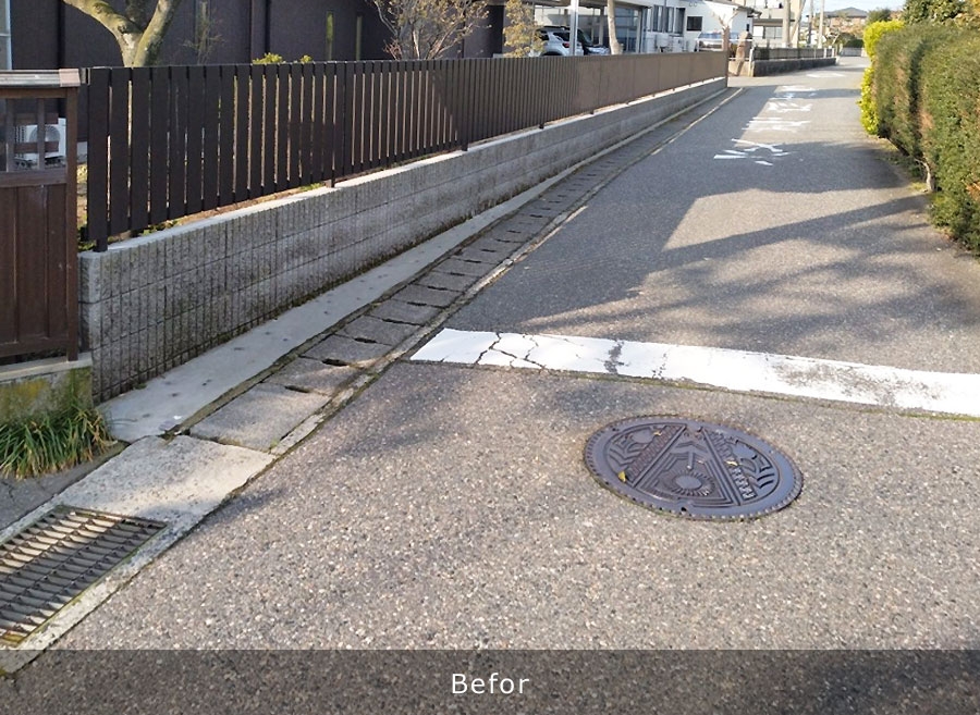 既存のU字排水溝を撤去し、新たにL型側溝を新設することにより表面水を雨水桝へ排出し、従来のU字溝の管理で行っていた排水路内のごみ掃除や泥上げ等の維持管理を簡略化でき、地域の方々の負担を軽減することができる。 L型側溝改良工:342m 改良雨水桝工:19基 落蓋式側溝工:17m