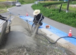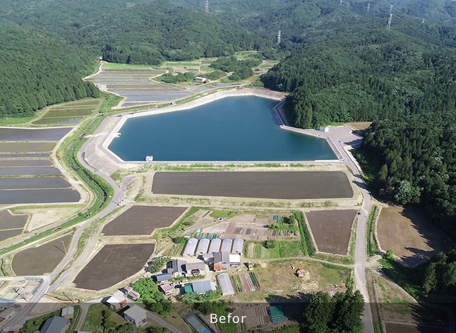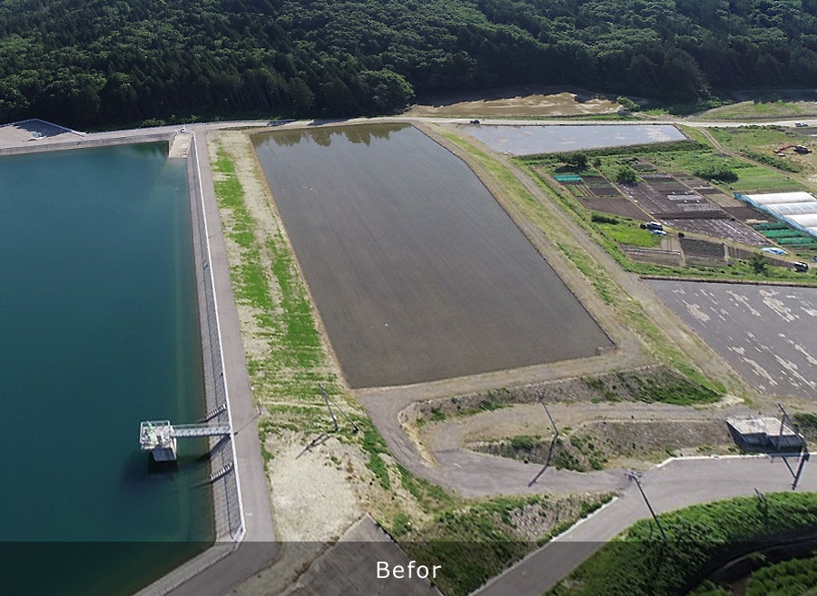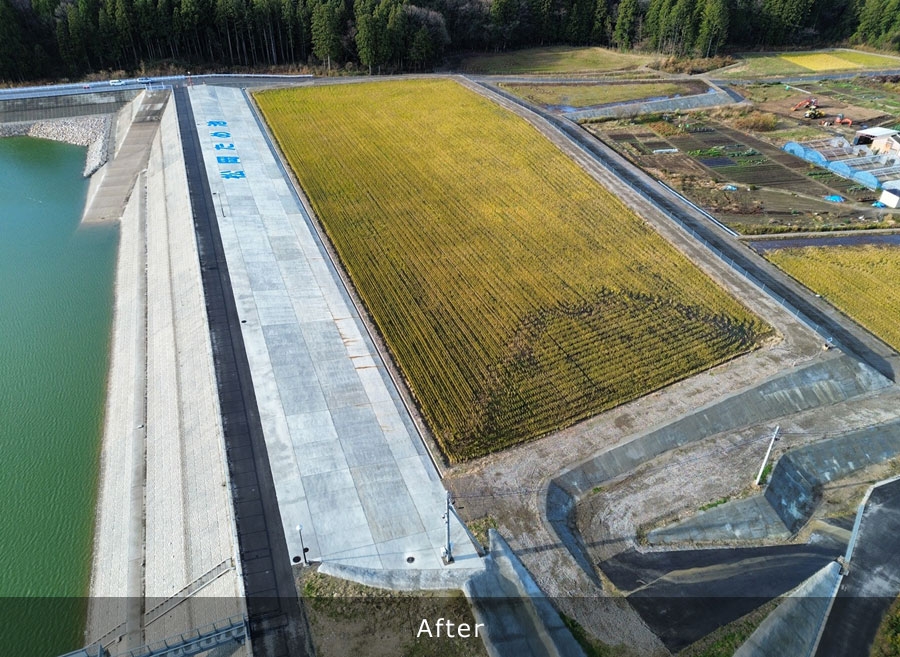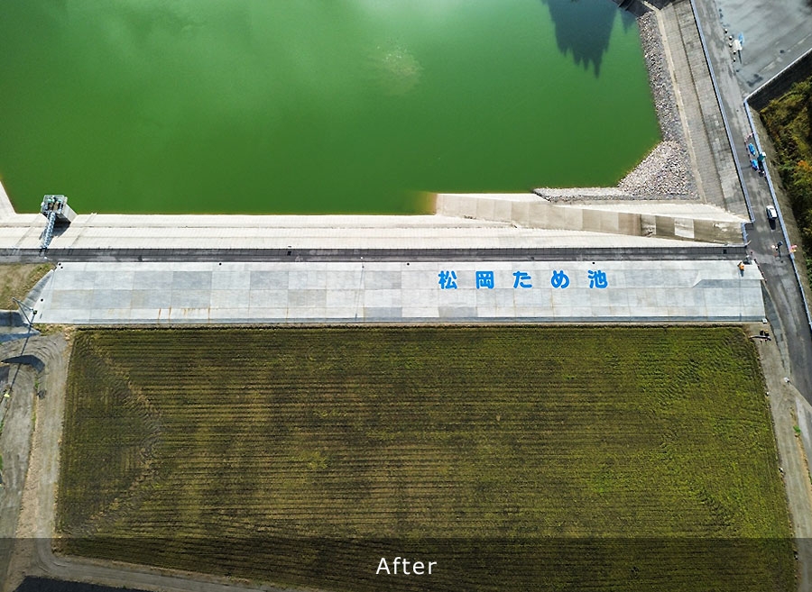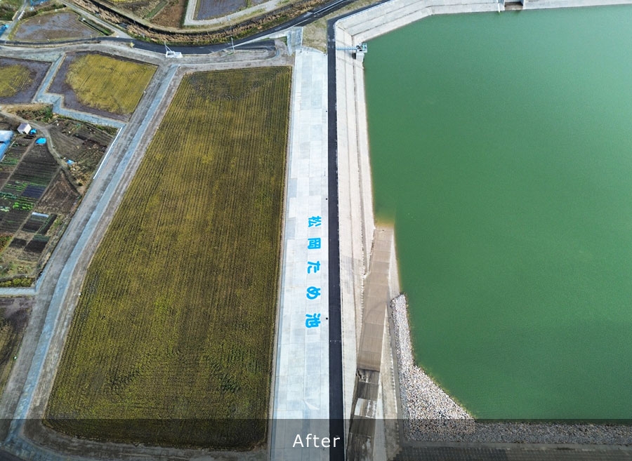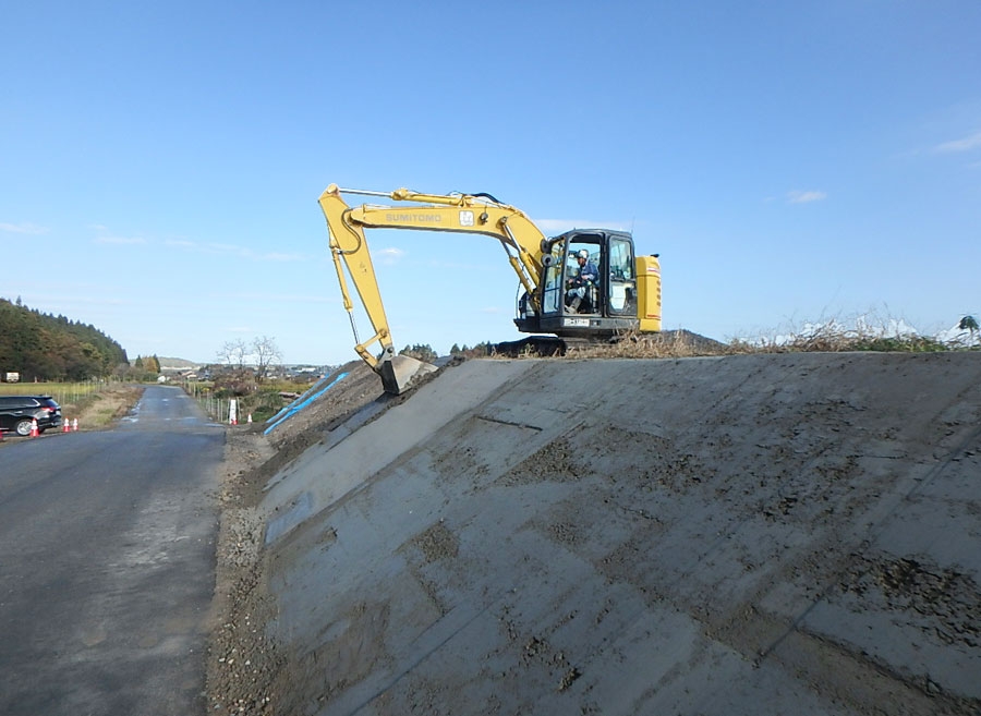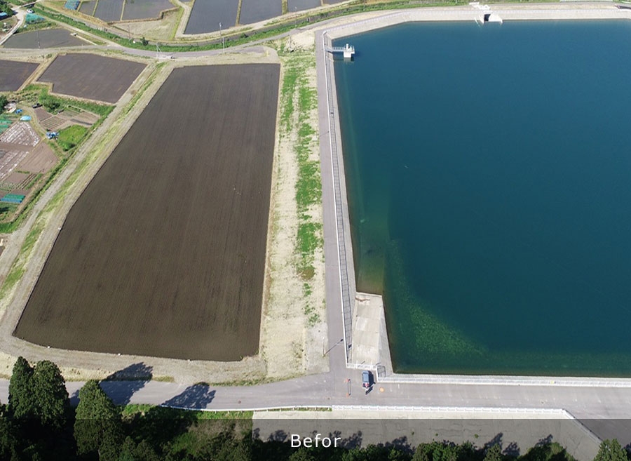 堤体法面を保護する為のコンクリート工とモルタル吹付工を行うと共に、ほ場法面の浸食、防草対策で法面を改良土で置換え盛土を行った。